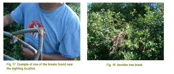 In investigating the surrounding area, Randy showed me a young sapling that had “breaks” made onto it. Randy stated that he found these a few days after the sighting. I believe it likely that these “breaks” were man-made, since Randy found them a number of days after the sighting had become common knowledge in the community which precipitated an influx of curious community members to the area. It is certainly within reason to believe that such “breaks” could have been made by a community member as a prank.