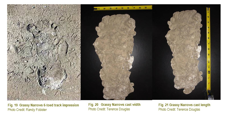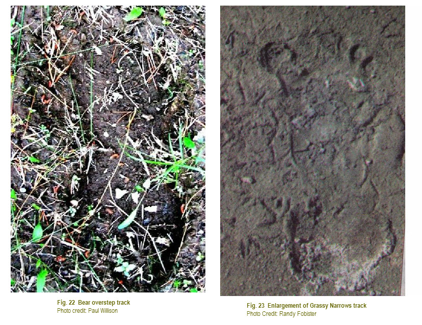 We believe that the sighting is a legitimate one. However, the "6-toed track" that Randy Fobister found near the sighting location, then photographed and cast, may not be a sasquatch track. Sometimes bear overstep tracks can look deceivingly like overlarge human-type tracks. Even seasoned outdoorsmen can make this innocent mistake. Compare the photo above at left (Fig. 22), a bear overstep track, with the track that Randy Fobister found and cast (Fig. 23). The similarities between the two are striking.