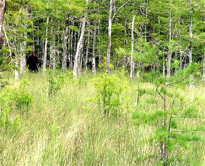 In it, a creature strongly resembling a gorilla appears to stride casually on two legs through a field of thigh-high grass on the edge of a cypress forest.