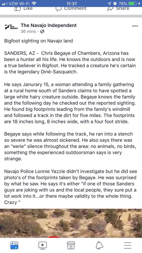 Navajo times published a story of a Bigfoot sighting