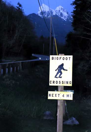 As you can see with your own eyes Washington State (or someone else) has seen fit to erect a Bigfoot Crossing sign on Highway 2 at the Espresso Chalet stand at Index, WA on Highway 2.