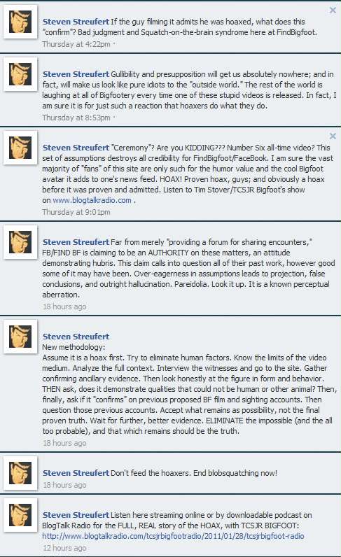 Astonishingly, FIND BIGFOOT-FACEBOOK (http://www.facebook.com/FindBigfoot) are still clinging on to the idea that this video clip could actually be real. This after their stunningly blind claim that it was real, and the "6th Best All-Time" Bigfoot footage. The case was investigated by Stover, and no evidence of Bigfoot was found around the tiny 3-inch uprooted tree, and the case was dumped in its deserved trash bin. It would seem, however, that Bigfoot on Facebook hasn't gotten that memo. Now SquatMaster has let it go to his head, and is bragging (just like Tim Fasano) about the high "ranking" of his video. Way to go and ENABLE the hoaxers, FindBigfoot! Now BF-FB say they are "investigating" the video and its provenance, which is a wise semi-retraction, but they are buying the guy's latest story that the video was real, after all. This DESPITE the SquatMaster's clear and apparently totally honest confession video (now removed from YouTube by him), where he stated that he did not in fact believe that there were any Bigfoot in Salt Fork, and further, that Bigfoot was only a legend from the old Indian days. How many times have these statements changed? How many times has a new version of the video been posted? Which one do YOU think is a lie? Someone who prevaricates to this degree should just not be trusted. He has cried "squatch" and "not squatch" a few too many times for our taste.