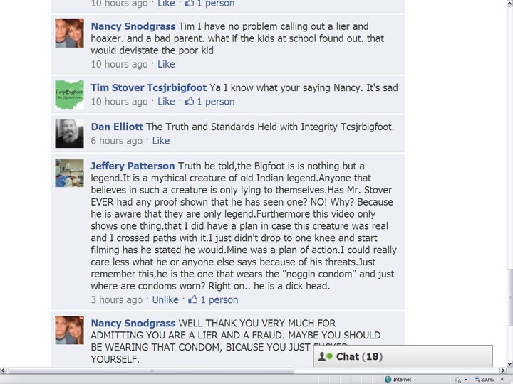 "Truth be told,the Bigfoot is is nothing but a legend. It is a mythical creature of old Indian legend. Anyone that believes in such a creature is only lying to themselves. Has Mr. Stover EVER had any proof shown that he has seen one? NO! Why? B...ecause he is aware that they are only legend. Furthermore this video only shows one thing,that I did have a plan in case this creature was real and I crossed paths with it. I just didn't drop to one knee and start filming has he stated he would. Mine was a plan of action. I could really care less what he or anyone else says because of his threats. Just remember this, he is the one that wears the 'noggin condom' and just where are condoms worn? Right on.. he is a dick head." WE SAY: Look in the Mirror, SquatMaster.