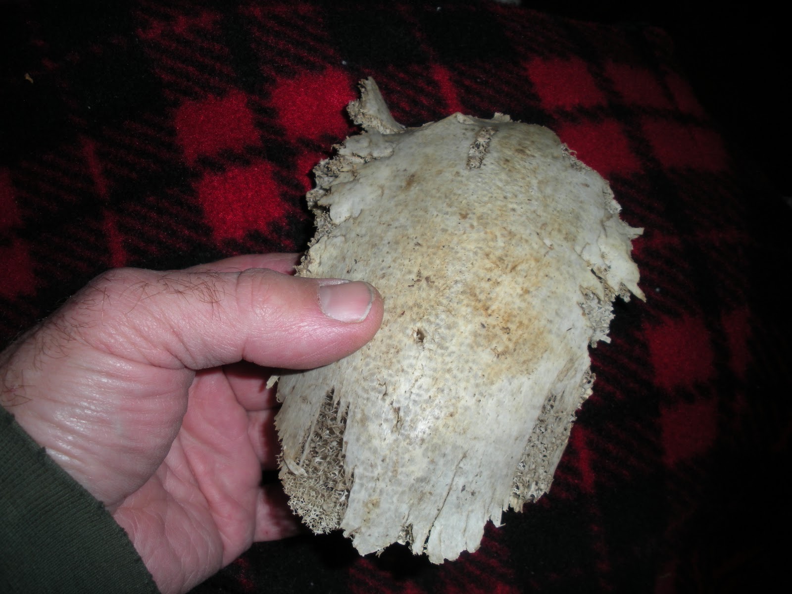 Zap. Less than two days later, there was a message on my answering machine from Allen. He said they found a bone at the base of the 'camera tree'! Once again, I could not believe my ears. I was up at Allen and April's before the next sunset. Allen handed me the bone. It was a saucer shaped bone with ragged edges that seemed too thick to be top of a skull, but it certainly had that the concave shape of a skull. (see photos below.)