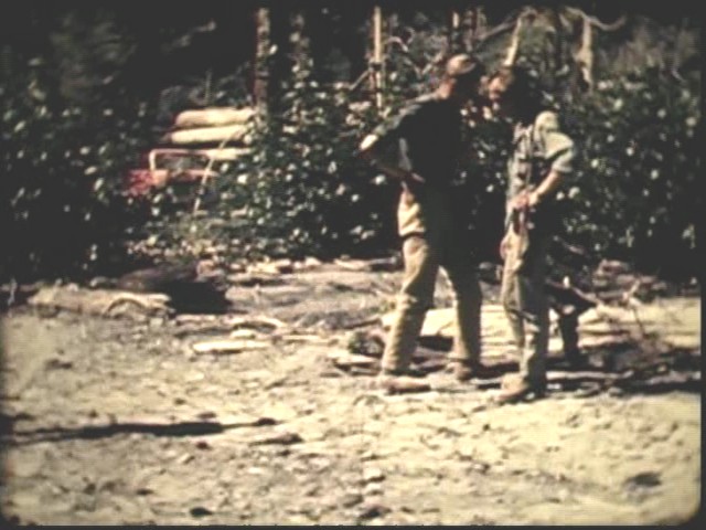 Photo above: John Green discusses tracks on the "wide spot" of the Bluff Creek sandbar with Bob Titmus at Bluff Creek, August 28, 1967...photo by Rene Dahinden.