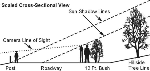 1) To arrive at accurate positional information and grades of the area, topographical maps, USGS online satellite maps, and sun angle data were first consulted. The following data is important for further calculations: Roadway direction, at the objects location, heading away from highway C6 = 317°, Sun azimuth at 6:30 PM, 08/02/92 = 274°, Sun altitude at 6:30 PM, 08/02/92 = 23°, Camera filming direction = 263°, Main road grade downhill towards C6 = 8.7%, Up hill slope of the woods beyond the main roadway = 20%, Altitude drop from roadway to camera = 10 feet. All directions are referenced to true, geographical north, as being zero degrees. Refer to the Aerial View below for illustration.