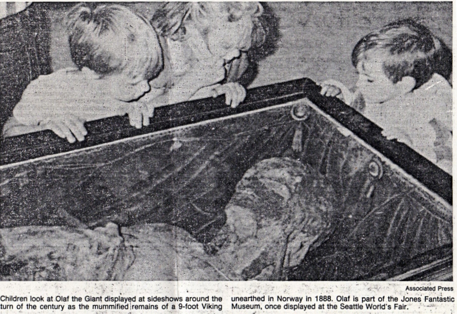 As many people know, Krantz would leave no stone unturned when investigating possible Bigfoot-related items. One story that is little known about Grover Krantz, which I ran across from Doug Higley, involves Krantz and his desire to examine the famed Olaf the Giant. (Please note, no photographs of Olaf the Giant have surfaced in my search. Do you have one? I’ve interviewed various “roadside America” photographers, and none has one. People did share that they had seen the exhibit during its heyday, but can’t recall taking its picture, due to the poor lighting.)