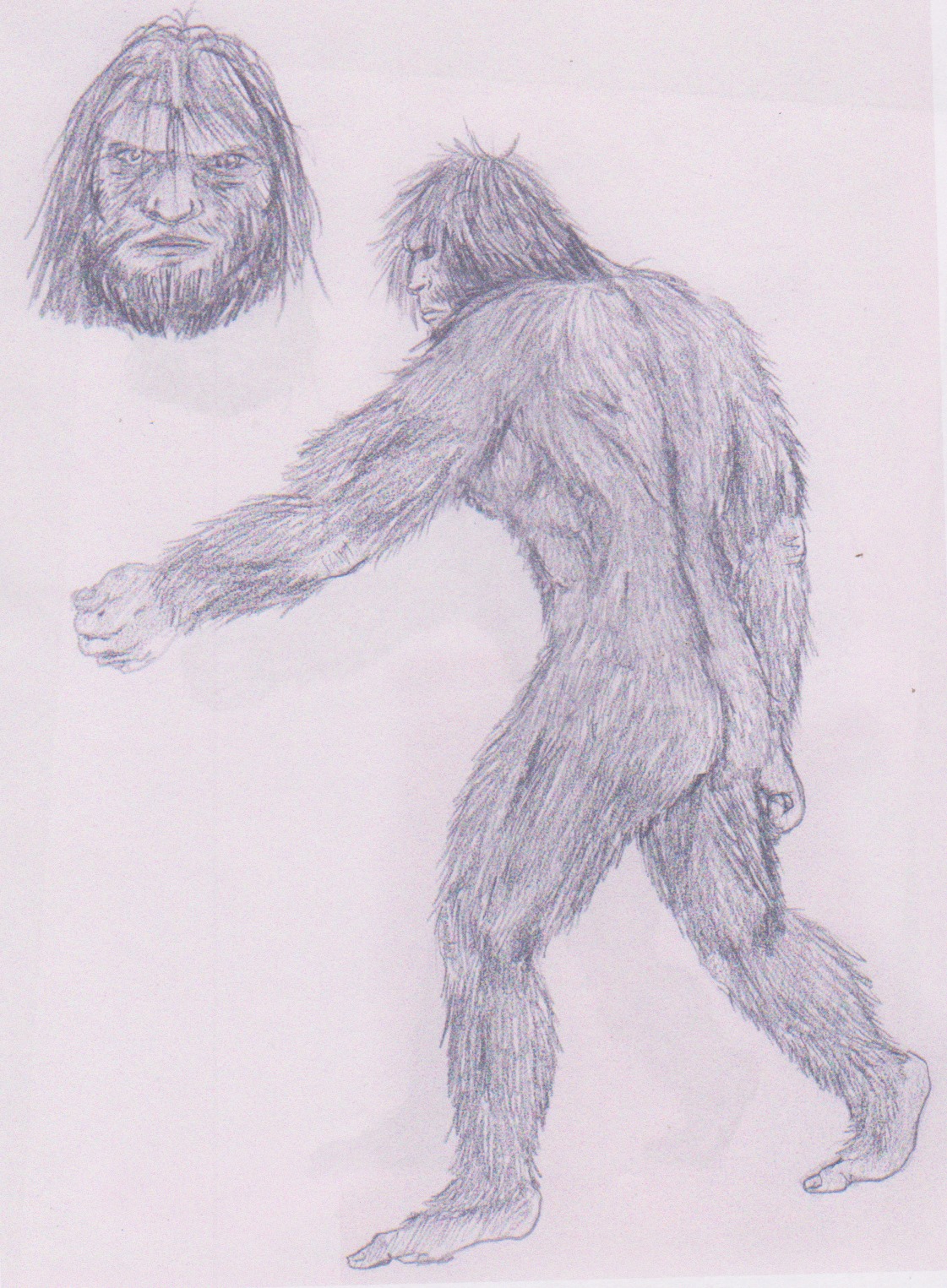 I thought I 'd share a witness sketch. This was one of the first sighting reports I ever took. It happened in the early 1980's. The witness, R.K. , was working as a newspaper delivery man. He was driving between Cliffton and Meridian Texas driving along HWY 6 at roughly 2-3:00 A.M. in the morning; when he observed a 7 foot on the side of the road. he slowed down to a stop about 30 foot from the creature, which stared at him for a second and then ran across the road. He got a good look at the face and build of the creature. He stated it was at least 7 foot tall, and covered in a light grayish hair. It had a lean build, and kept its right arm rather tight against its body, as if it had been injured and didn't heal right. The witness went on to state that the muscle on the creature was extremely impressive. I worked with R.K. for several hours on a sketch, and he said I pretty much nailed it.