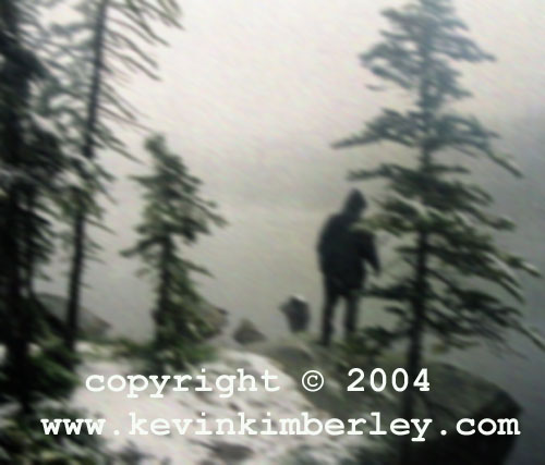 Well I guess I should stop blabbering and tell how it happened. My search team and I had been in the area for three days and this was the last morning we were there. We were camped on the edge of a very high alpine lake, as you can see by the snow and heavy fog. We had been very hopeful of contact since the area is so remote, but still very close to an area that has a long history of Bigfoot activity. The lake was chosen since it is well stocked with fish, obviously artificially stocked, and they can be caught in the shallow water while they search for food. Anyway it made sense to identify this high protein food source in such a harsh environment.
