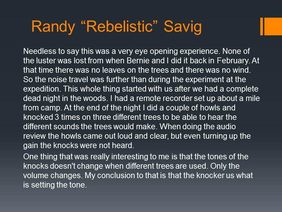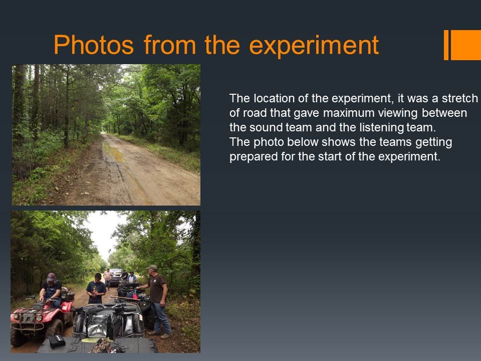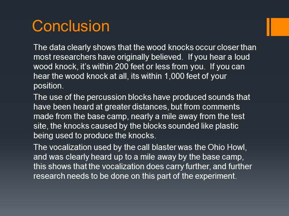 The MABRC and APES groups conducted experiments to see if the distance of wood knocks and vocalizations varied under different conditions and at what distances they could be heard from. What the data showed afterwards, along with the personal experiences of those who participated, it opened their eyes to some dramatic results.