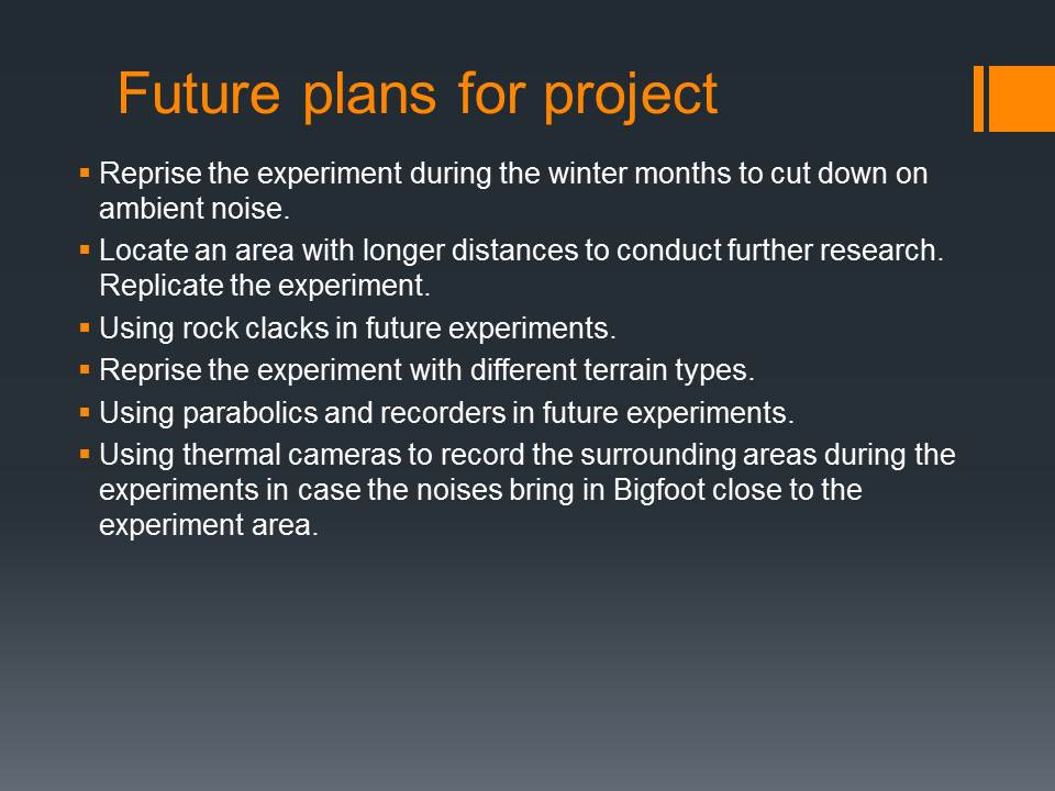 Phase 3 will now be planned out, in it, we will be seeing what the distance decibel ranges are using parabolics and recorders of various types and makes. To see the difference in each according to sound.