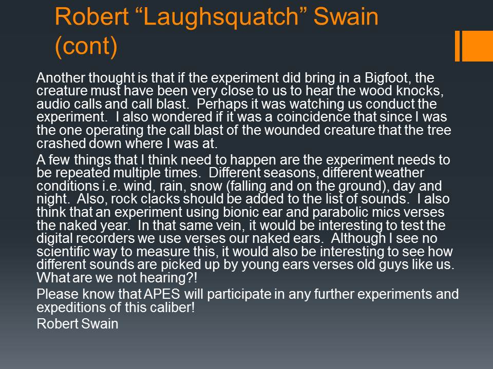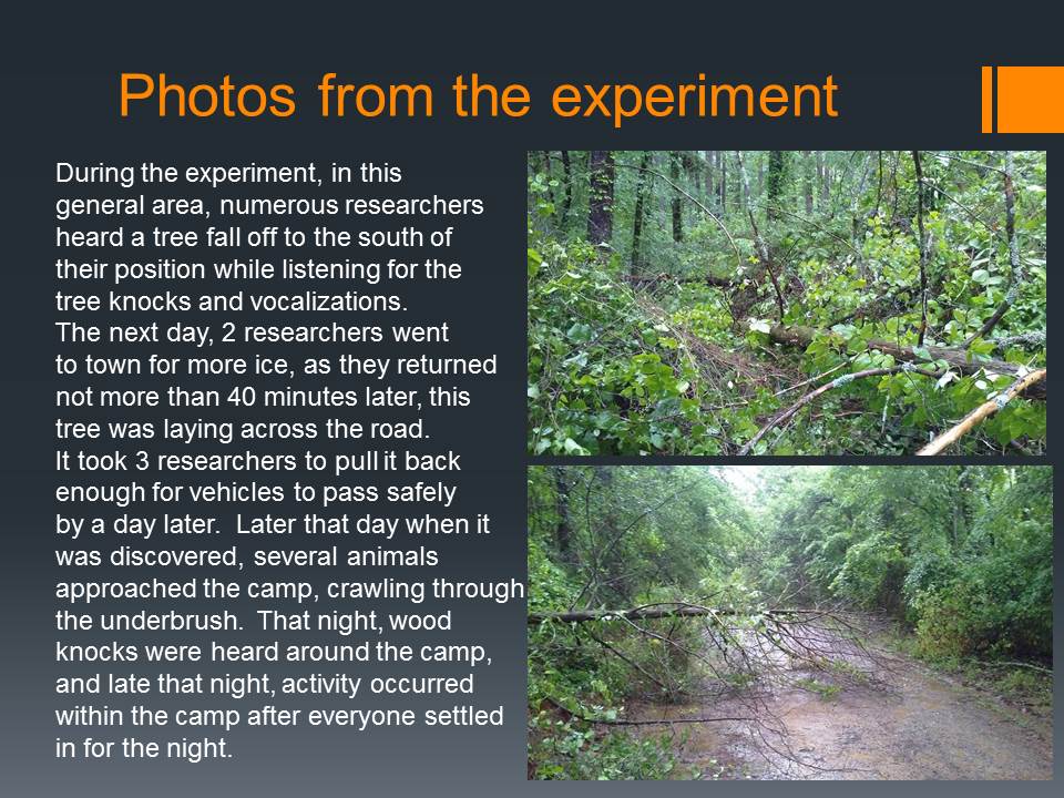 The MABRC and APES groups conducted experiments to see if the distance of wood knocks and vocalizations varied under different conditions and at what distances they could be heard from. What the data showed afterwards, along with the personal experiences of those who participated, it opened their eyes to some dramatic results.
