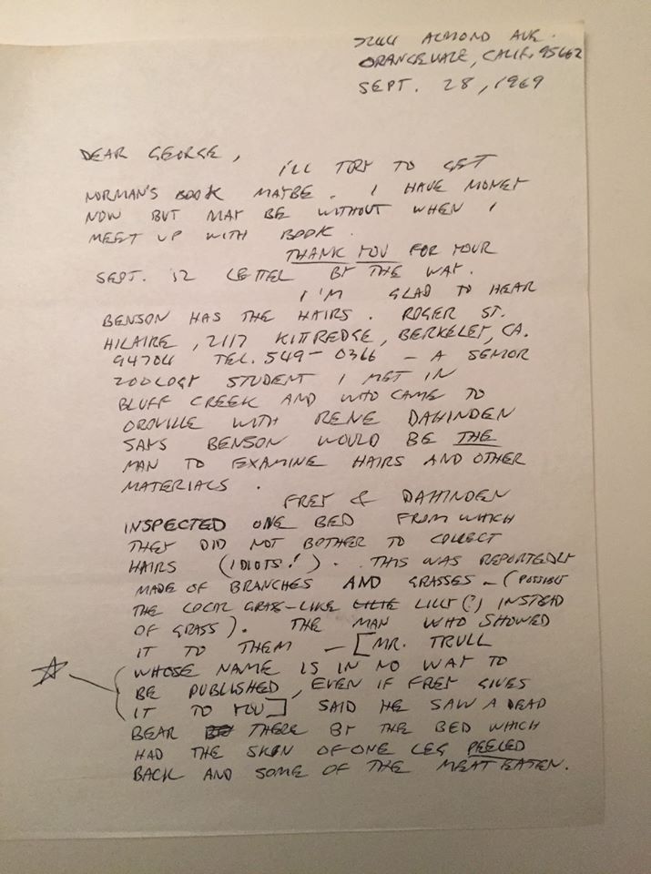 Here's a classic letter, from September 1969. Jim McClarin writes to George Haas talking about the supposed Bigfoot beds [bear nests] found around Bluff Creek, and as an aside calls Rene Dahinden and associate "IDIOTS!"