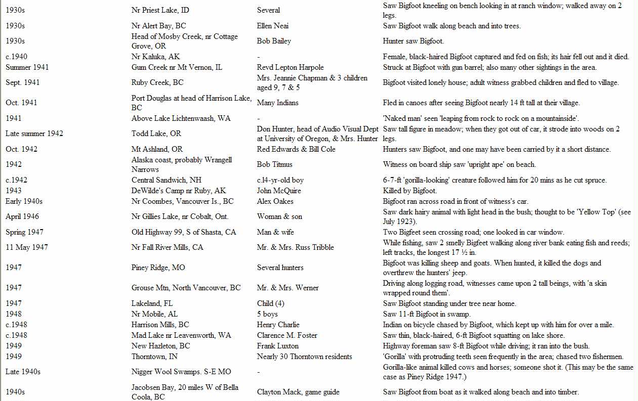 Chronological List of Bigfoot Sightings 1901 - 1950