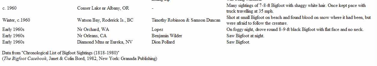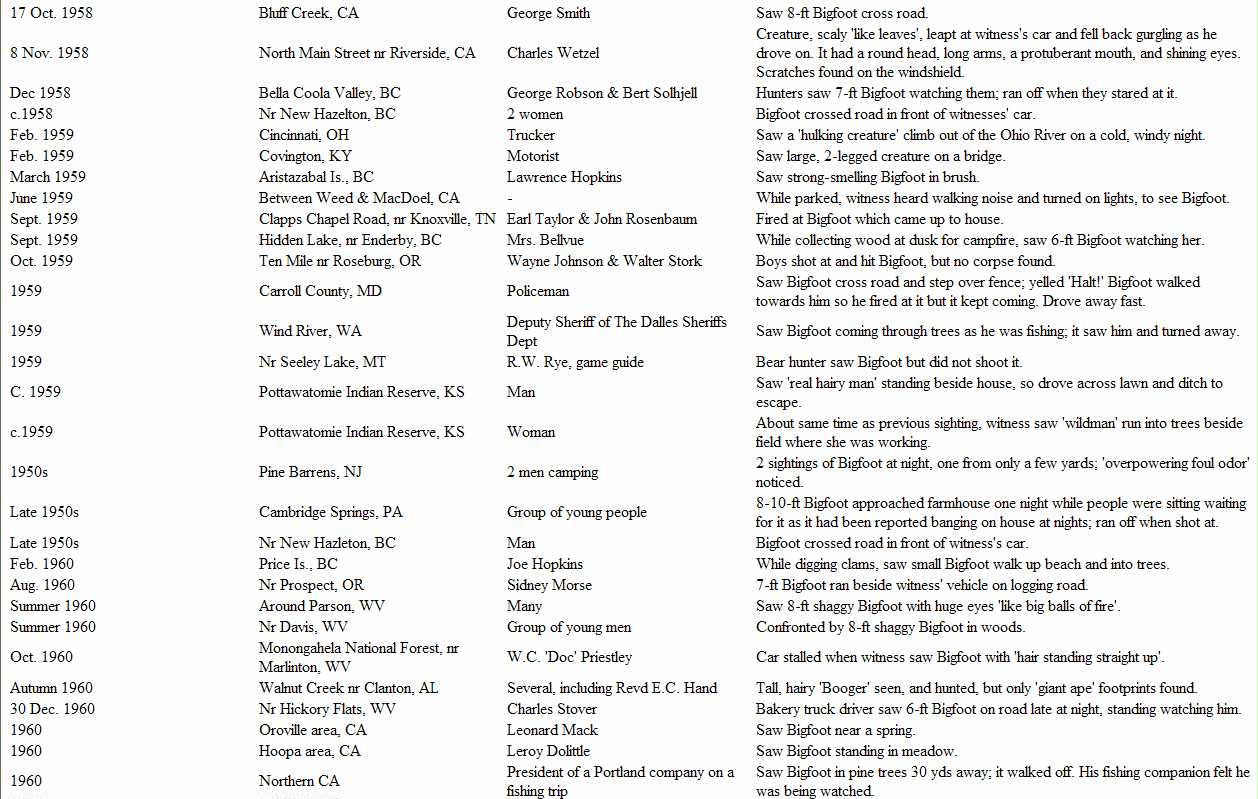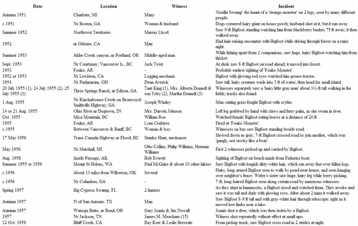 Chronological List of Bigfoot Sightings 1951 - 1960