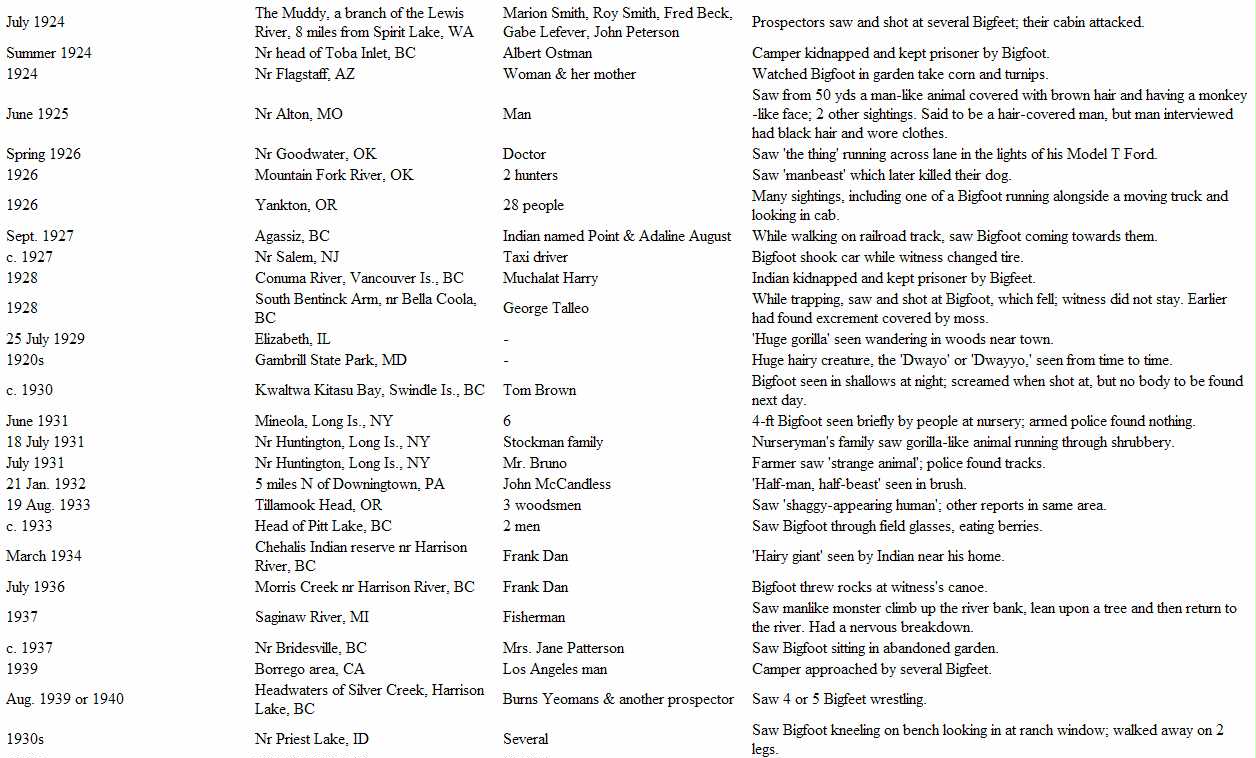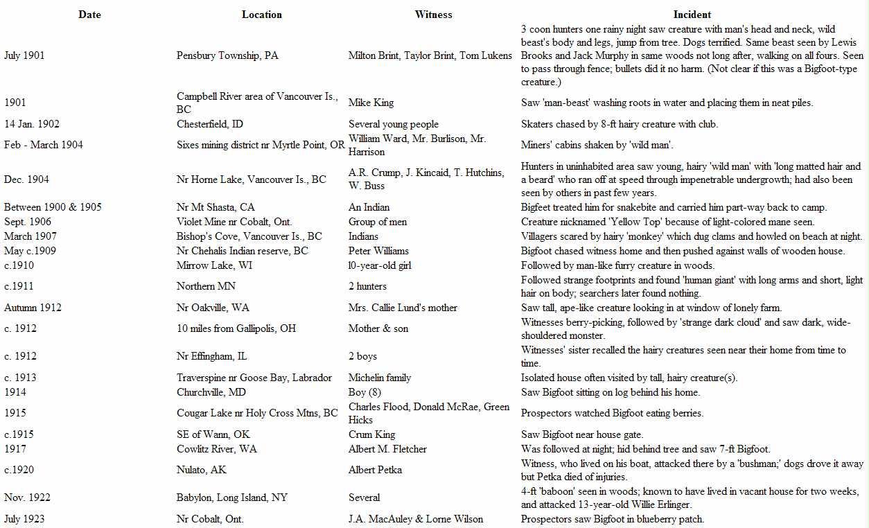 Chronological List of Bigfoot Sightings 1901 - 1950