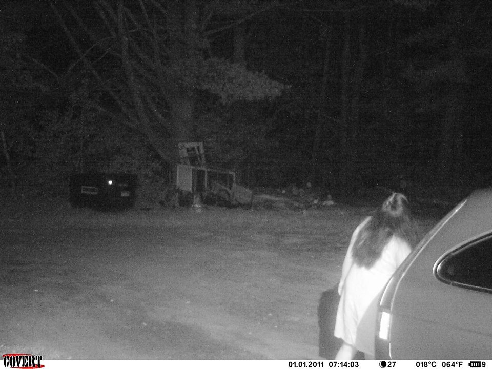 Picture #1: A women is stepping outside her back porch to get the milk she forgot in her car. If you look to the right of the screen doors you can see something that looks hunched over, shoulders facing to the camera. *I see a very dark haired, heavily muscled, (what I believe to be a) juvenile Sasquatch squatting/kneeling behind a small woodpile*